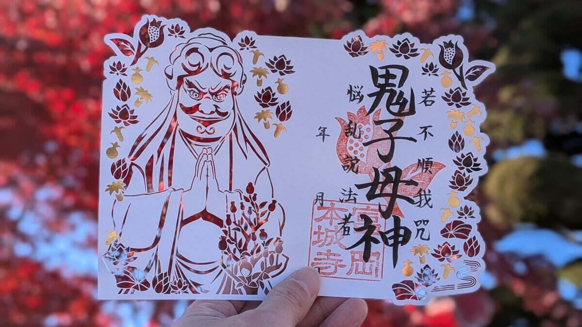 A5サイズ(通常サイズの御朱印帳の見開き)で、子育の神様として地元富岡市でも名物になっている鬼子母神さまを美しい切り絵にしています。